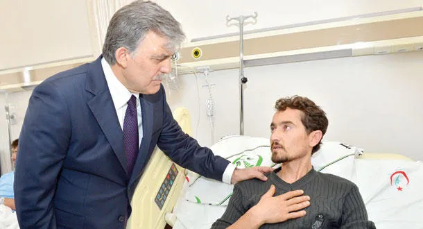 الرئيس التركي عبد الله غل يزور أحد مصابي كارثة منجم سوما الواقع على بعد مائة كلم شمال شرقي أزمير أمس (رويترز)