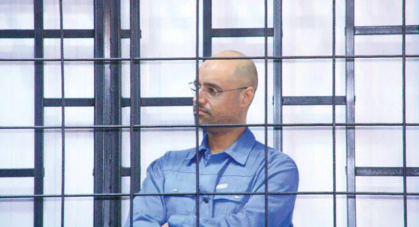 سيف الاسلام القذافي نجل العقيد القذافي لدى حضوره إحدى جلسات محاكمته في مدينة الزنتان أمس (رويترز)