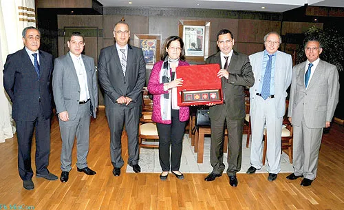 وزير الإعلام المغربي مصطفى الخلفي وقيادات الوزارة لدى استقباله مساء أول من أمس نظيرته البحرينية سميرة رجب («الشرق الأوسط»)