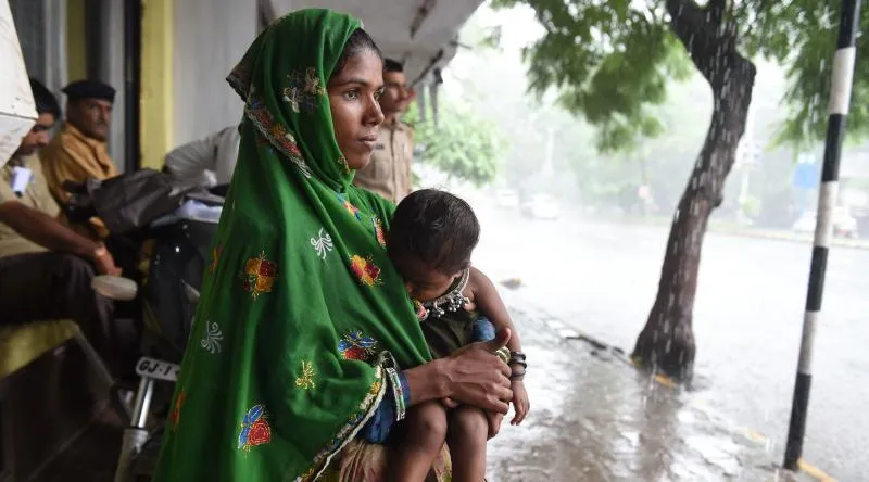 امرأة هندية تحمل طفلها بانتظار توقف الأمطار (أ.ف.ب)