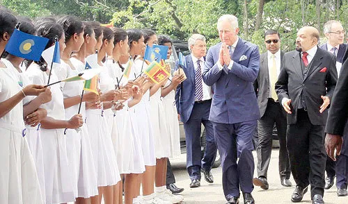 ولي العهد البريطاني الأمير تشارلز يحيي فتيات كن في استقباله أثناء زيارته للمتحف الوطني في كولومبو أمس. وكان تشارلز افتتح في وقت سابق أمس أشغال قمة رابطة الكومنولث بالعاصمة السريلانكية (رويترز)