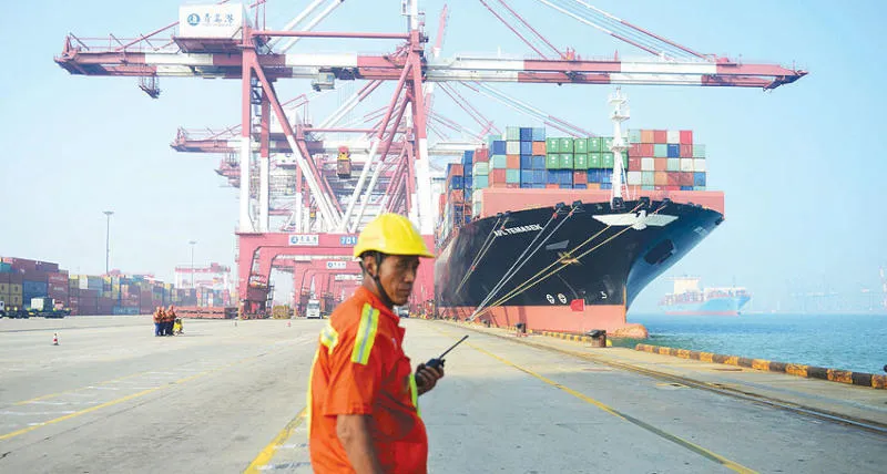 عامل في ميناء كينغداو بشرق الصين يراقب باخرة شحن وهي راسية في الميناء (أ.ف.ب)