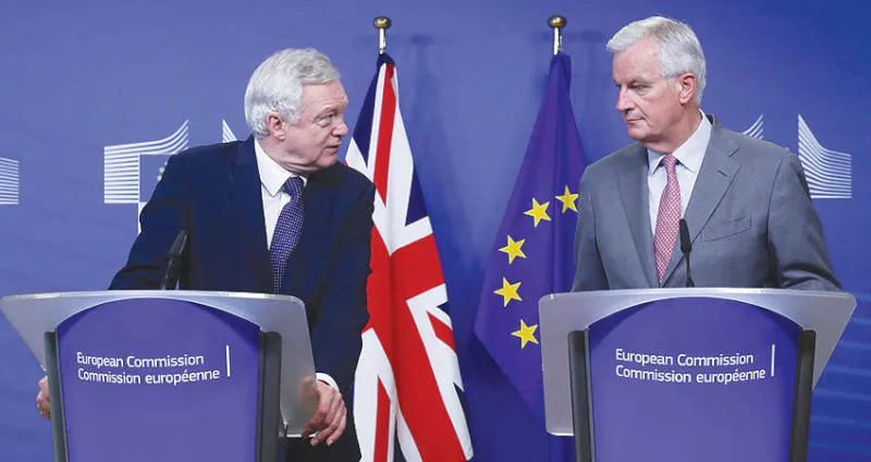 ديفيد ديفيس (يسار) مسؤول ملف المفاوضات للخروج من الاتحاد الأوروبي ونظيره ميشيل بارنييه خلال مؤتمر صحافي مشترك في بروكسل أمس (رويترز)