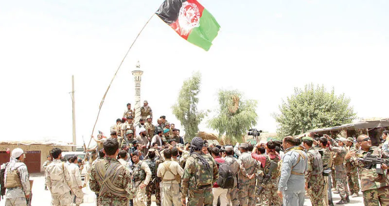 جنود حكوميون يرفعون العلم الأفغاني في ساحة مديرية نوى بإقليم هلمند بعد معارك دامت يومين ضد مقاتلي حركة طالبان (إ.ب.أ)