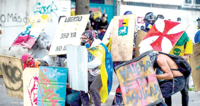 معارضون يصطدمون بقوات مكافحة الشغب في كراكاس أمس (أ.ف.ب)