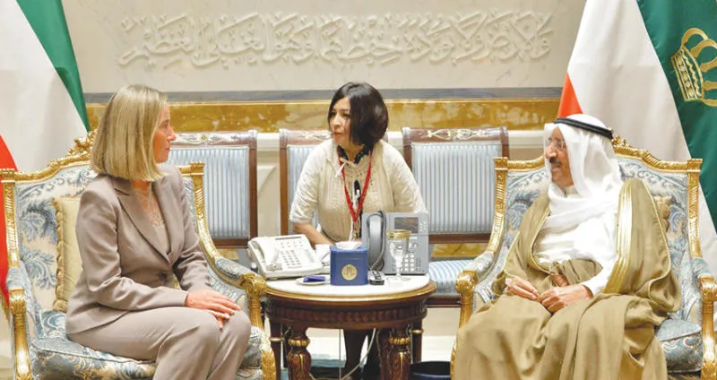 استقبل أمير دولة الكويت الشيخ صباح الأحمد الجابر الصباح أمس الأحد الممثلة العليا للسياسة الخارجية والأمنية في الاتحاد الأوروبي فيديريكا موغيريني التي بدأت زيارة للكويت يُتوقع أن تُركز على ملف أزمة قطر والعلاقات الثنائية بين الاتحاد الأوروبي ودول الخليج.