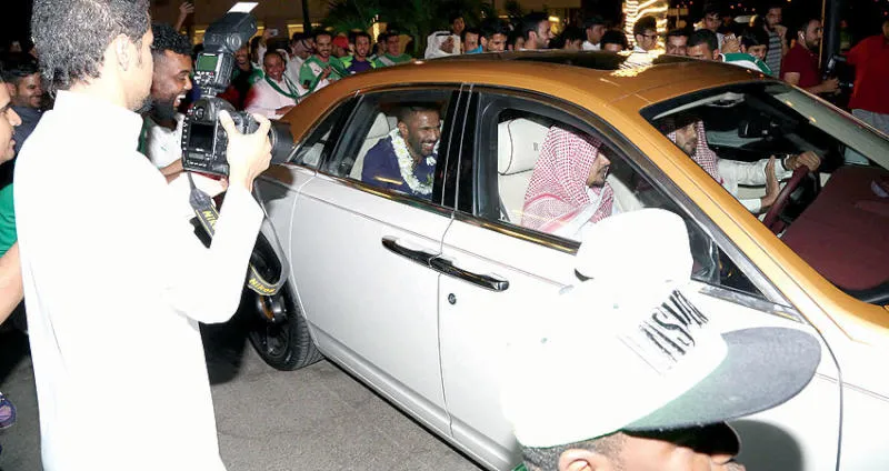 العويس في السيارة محاطاً بالجماهير التي استقبلته بمطار جدة (تصوير: عدنان مهدلي)