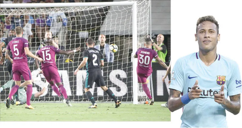 واصل المهاجم البرازيلي نيمار دا سيلفا المطلوب من باريس سان جيرمان الفرنسي، تألقه وقاد فريقه برشلونة الإسباني إلى وقف الانتصارات المتتالية لمانشستر يونايتد الإنجليزي 1-صفر في كأس الأبطال الدولية لكرة القدم في الولايات المتحدة.