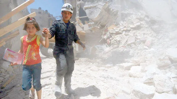 عنصر في الدفاع المدني يخلي طفلة من مبنى بعد استهدافه من الطيران الحربي النظامي في حي الكلاسة بحلب أمس (رويترز)