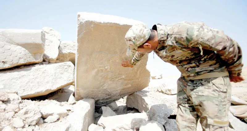 عنصر أمن عراقي يعاين آثاراً دمرها «داعش» في موقع النمرود جنوب الموصل أمس (رويترز)