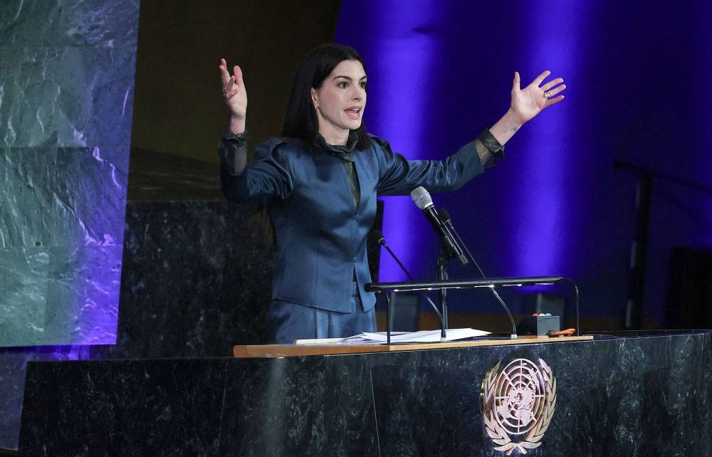 الممثلة آن هاثاواي تلقي خطاباً في الأمم المتحدة في اليوم العالمي للمرأة (أ.ف.ب)