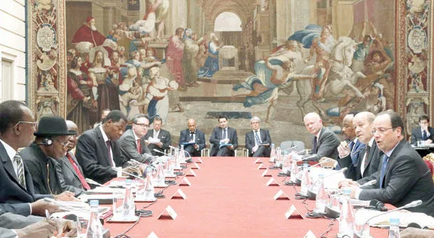 هولاند (يمين) يتحدث خلال القمة التي التأمت في الإليزيه وخصصت لموضوع الأمن في نيجيريا أمس (أ.ف.ب)