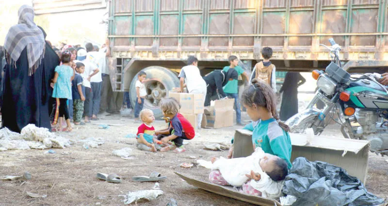 فارون من معقل «داعش» في الرقة يتلقون مساعدات إنسانية من «يونيسيف» في مخيم مؤقت بالطبقة (أ.ف.ب)