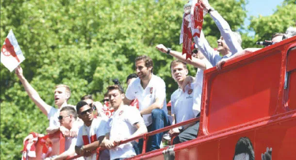 وأقلت حافلتان مكشوفتان لاعبي آرسنال أمس، وقامتا بجولة حول استاد الإمارات لتحية المشجعين، الذين احتشدوا بالآلاف لتكريم المدرب الفرنسي آرسين فينغر ولاعبيه بعد الإنجاز الكبير.