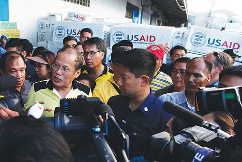 الرئيس الفلبيني بنينو أكينو يجيب عن أسئلة الصحافيين بعد أن تفقد جهود الإغاثة في الأقاليم الشرقية التي دمرها الإعصار «هايان» أمس (رويترز)
