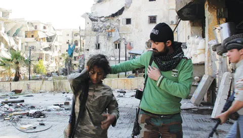 مقاتل سوري يساعد صبيين قبل انطلاقهم في دورية في حي صلاح الدين بمدينة حلب أمس (أ.ف.ب)
