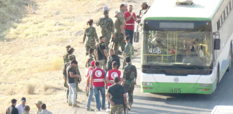 الصليب الأحمر في استقبال مقاتلي «سرايا أهل الشام» لدى وصولهم إلى الفليطة السورية قادمين من لبنان أول من أمس (أ.ف.ب)