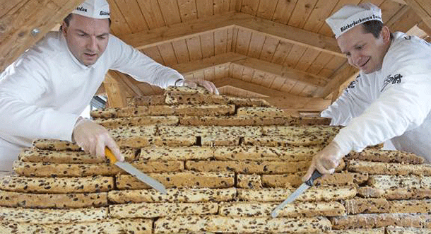 خبازان يوزعان كعك "الشتولن" الذي يحتوي الزبيب والفواكه احتفالا ببدأ موسم أعياد شهر ديسمبر (كانون الأول) في مدينة دريسدن الألمانية