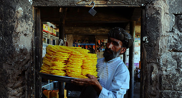 عامل أفغاني يحمل حلوى (جلابي) التقليدية لبيعها بمناسبة الشهر الفضيل