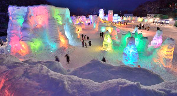أشخاص يزورون مهرجان الجليد في بحيرة شيكوتسو شيتوس التي تنيرها أضواء ملونة لإظهار عالم رائع في شيتوس
