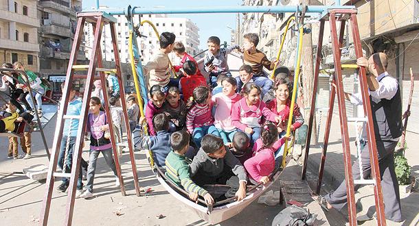 أطفال يلعبون في مدينة حلب السورية في أول أيام عيد الأضحى أمس