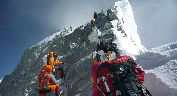 يظهر في هذه الصورة متسلقون مجهولون يقتربون من خطوة هيلاري (إدموند هيلاري أول شخص يصل الى قمة إفرست) بينما يحاولون الاندفاع الى قمة الجبل من جهة النيبال