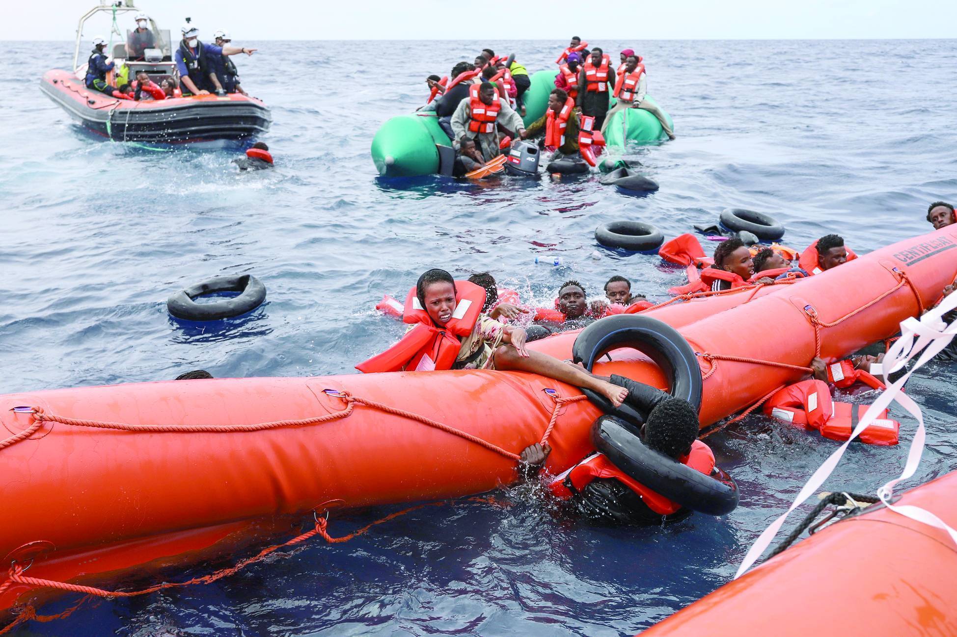 مهاجرون تم إنقاذهم بعد غرق مركبهم الذي انطلق من سواحل ليبيا باتجاه أوروبا (أرشيفية- أ.ب)