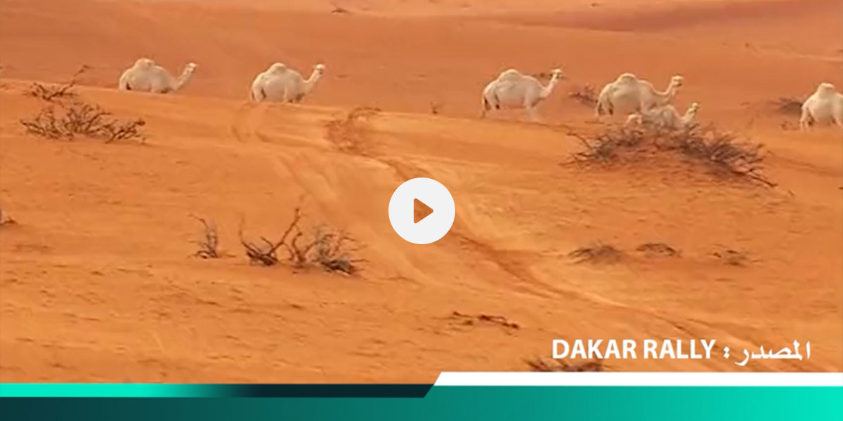 متسابق يجتاز قطيعا من الإبل في رالي داكار السعودية
