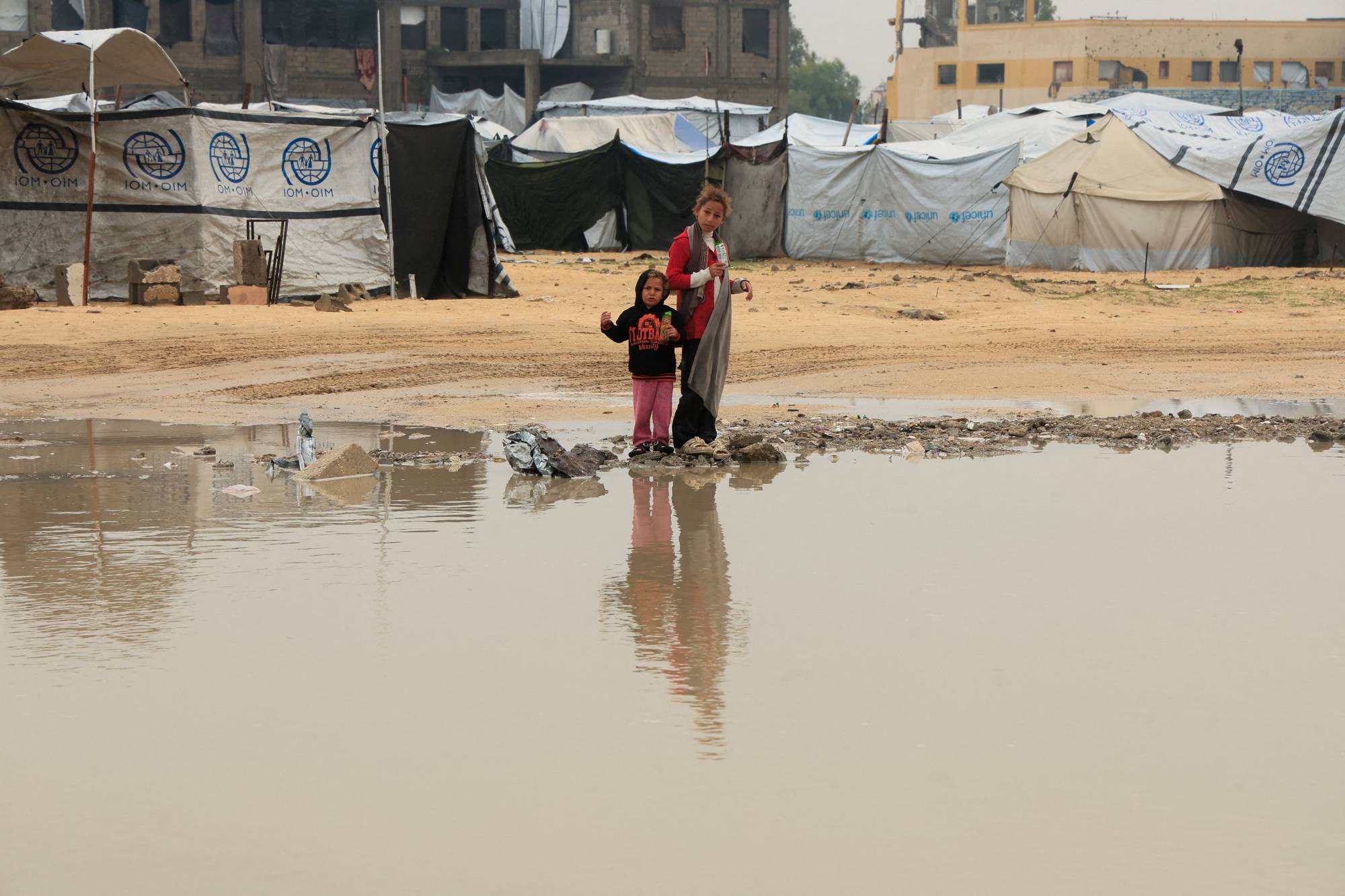 أطفال فلسطينيون يقفون بجوار بركة ماء في يوم ممطر بخان يونس (رويترز)