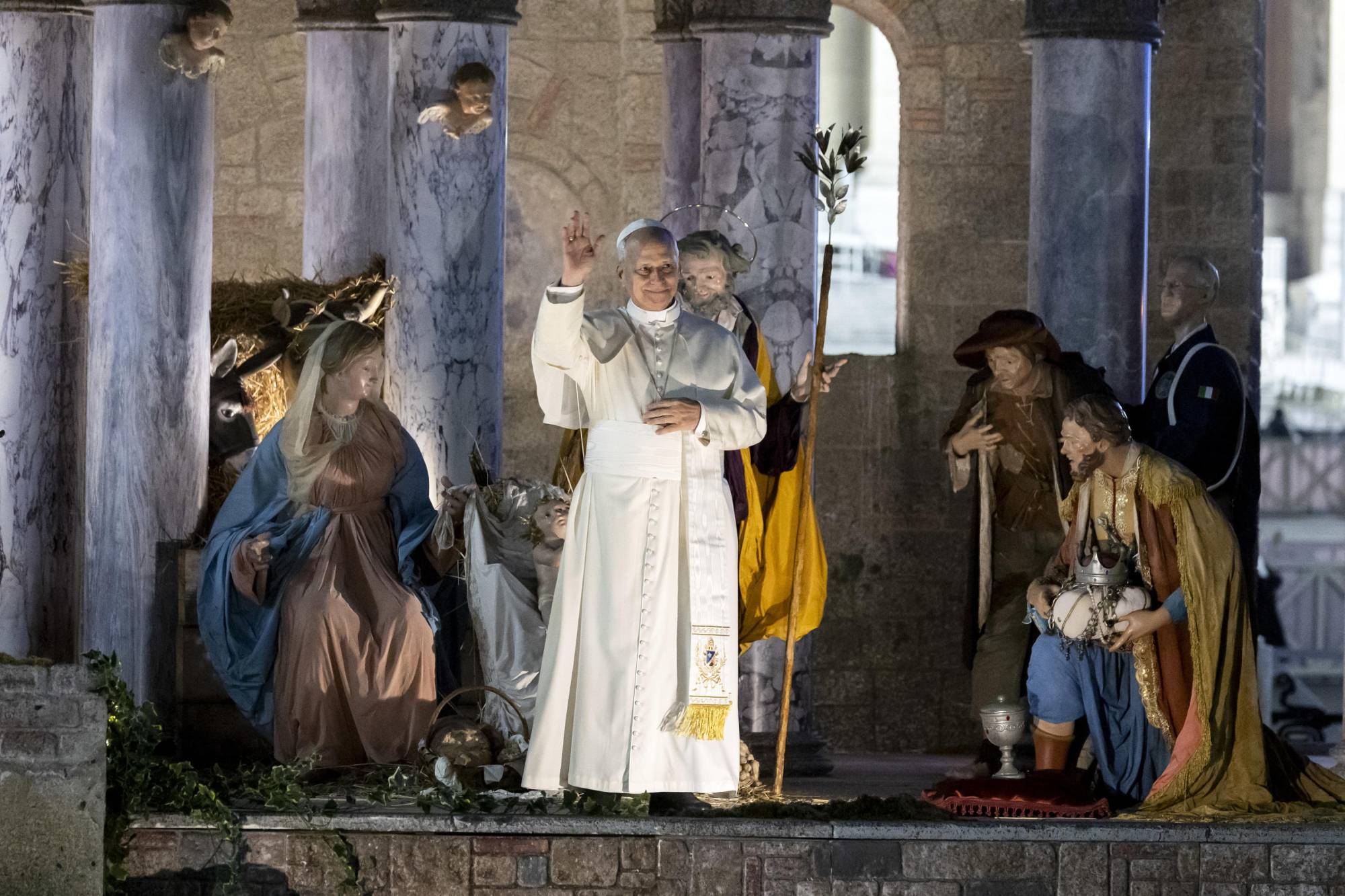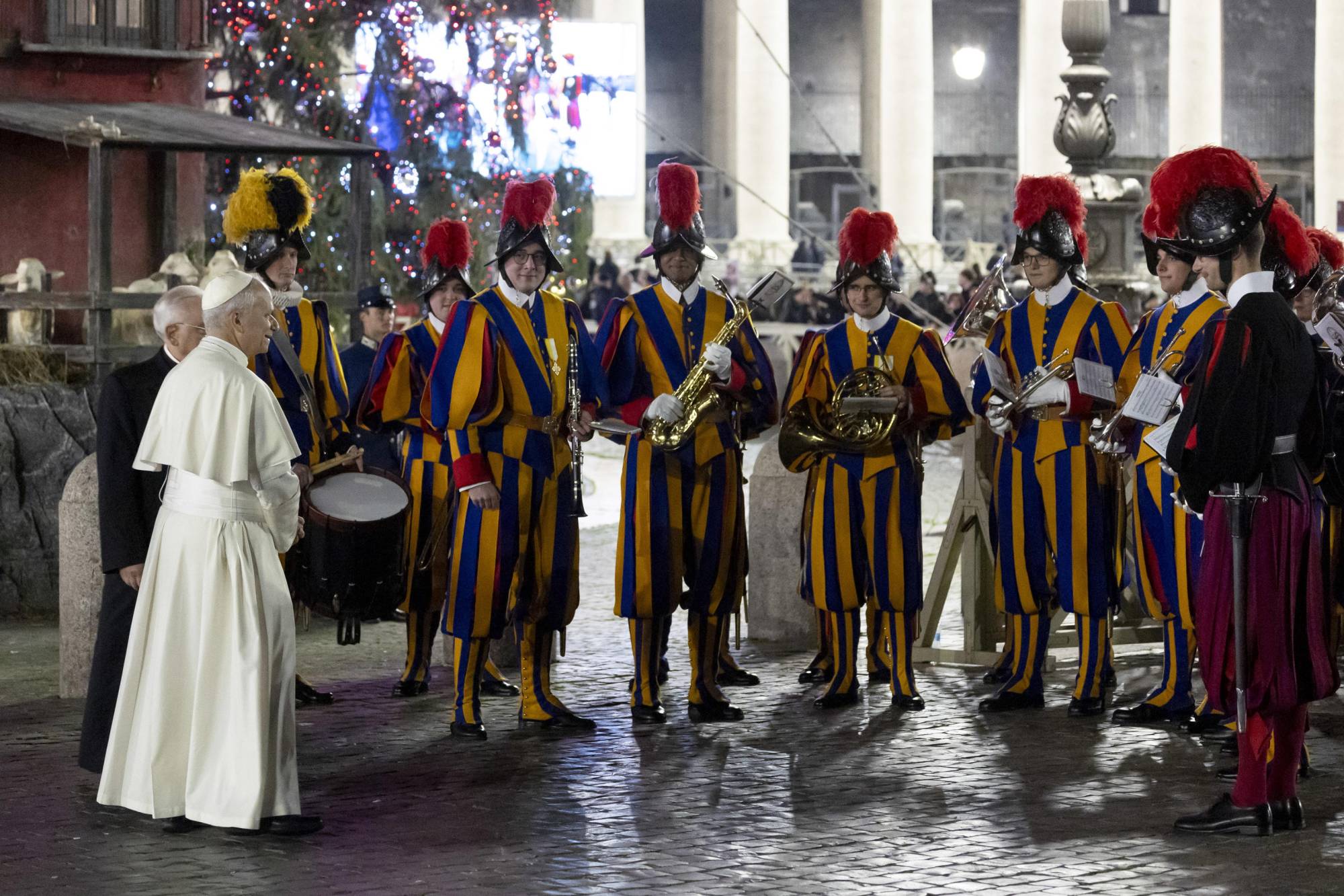 البابا يلتقي أفراد الحرس السويسري أثناء زيارته لمغارة الميلاد في ساحة القديس بطرس (إ.ب.أ)