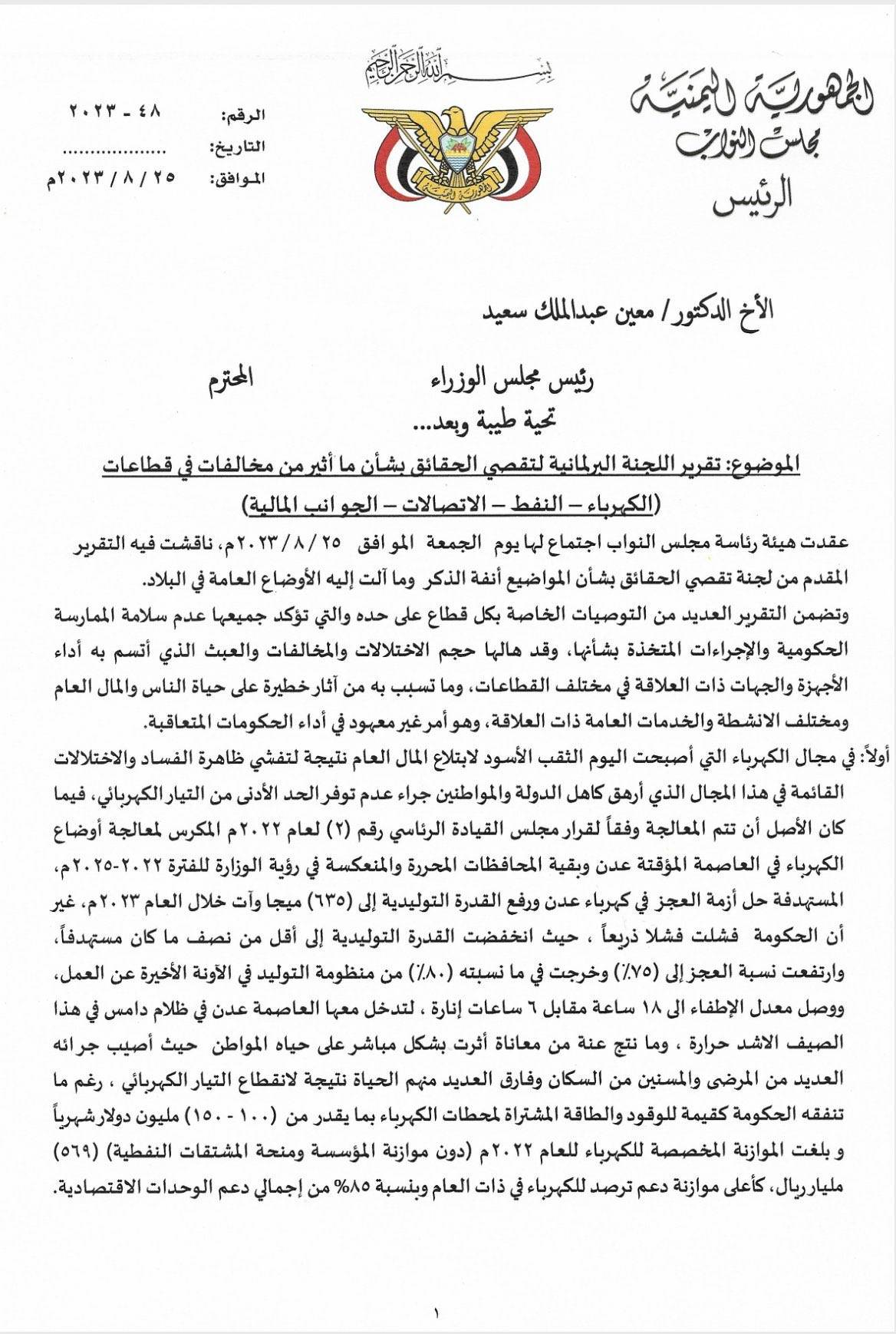 التوصيات البرلمانية جاءت في رسالة بعثت بها هيئة رئاسة البرلمان عقب اجتماع لها وقف أمام الأوضاع الراهنة في البلاد، وناقش التقرير المقدم من اللجنة البرلمانية لتقصي الحقائق بشأن ما أُثير من مخالفات في قطاعات الكهرباء والنفط والاتصالات والجوانب المالية.