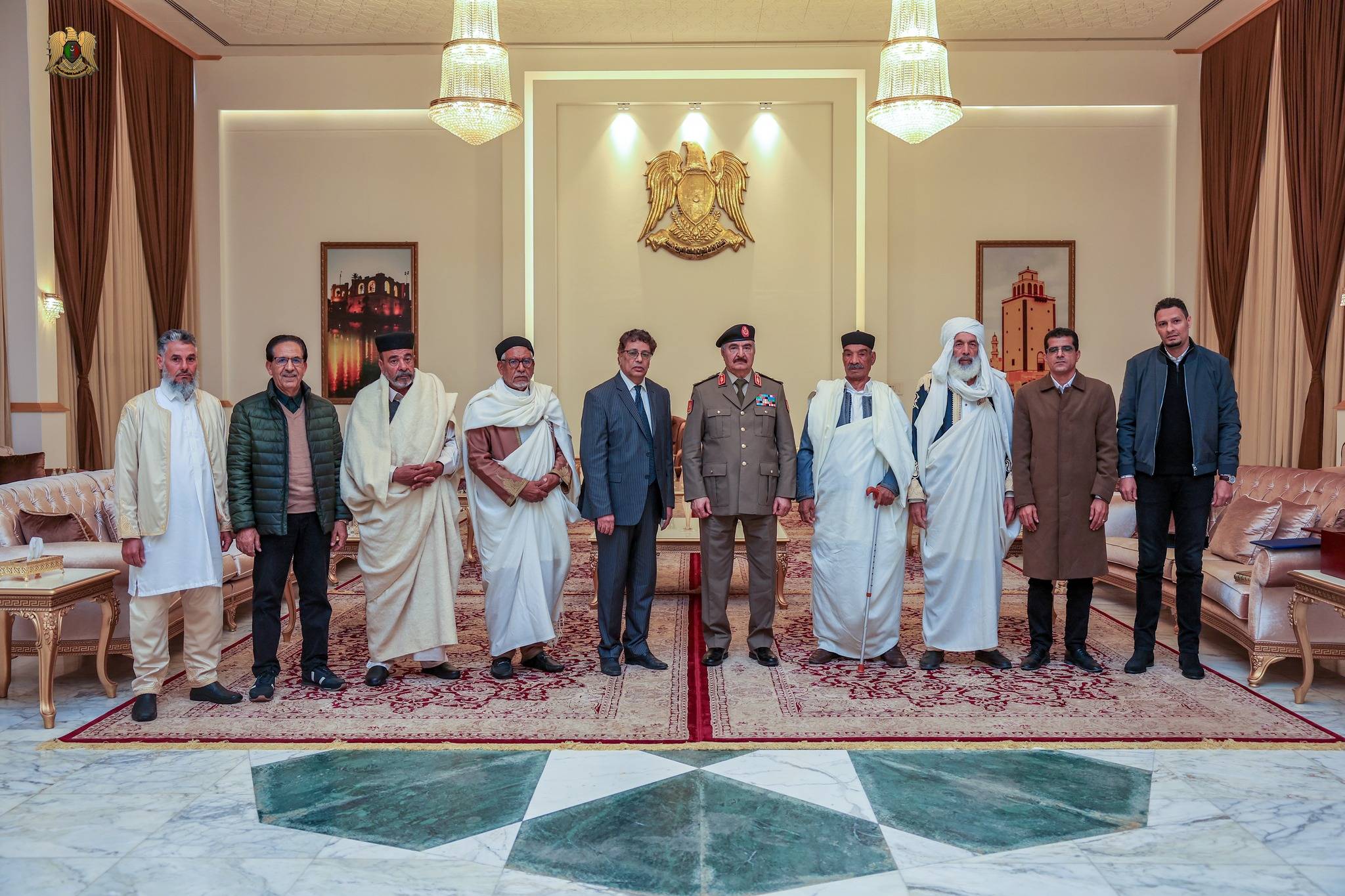 في شأن مختلف، نقل القائد العام لـ«الجيش الوطني» المُشير خليفة حفتر، عن وفد من عائلة الراحل الدكتور إبراهيم مصباح بوخزام، التقاه مساء (الاثنين)، رفقة وفد من مشايخ وأعيان قبيلة الحساونة بمقره في مدينة بنغازي (شرق) دعمهم الكامل لقيادة الجيش، ودورها المهم في حفظ أمن الوطن واستقراره، وإشادتهم بالجهود المبذولة في بناء المؤسسة العسكرية، وما حققته من إنجازات في كل المدن الليبية.
