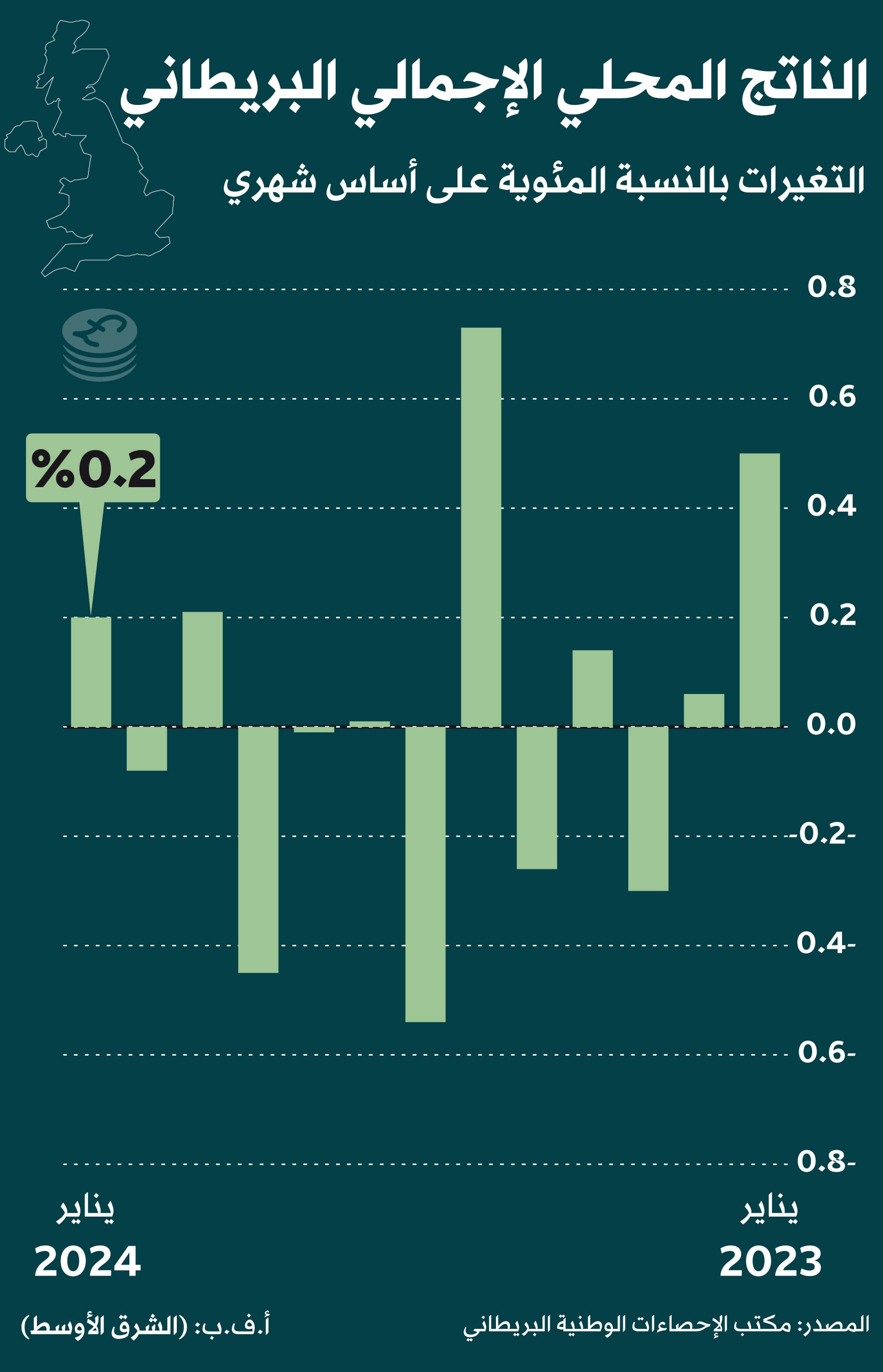 استعاد الاقتصاد البريطاني النمو، في بداية عام 2024، مما منح رئيس الوزراء ريشي سوناك بعض الراحة قبل الانتخابات المتوقعة هذا العام، وذلك بعد دخوله في ركود ضحل خلال النصف الثاني من عام 2023، وفقاً للبيانات الرسمية.