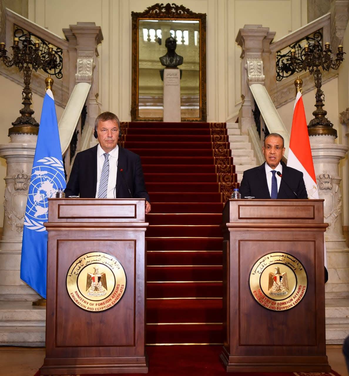 وخلال مؤتمر صحافي مع لازاريني، قال وزير الخارجية المصري، إن «مسألة التهجير خط أحمر للأردن ومصر والدول العربية، ولن يتم السماح به تحت أي ظرف من الظروف... وهراء أن نقول إن هناك تهجيراً طوعياً». وأكد عبد العاطي أن «تعنت إسرائيل عقبة رئيسية أمام تحقيق تقدم في مسار التهدئة»، داعياً إسرائيل للقبول بمقترح ويتكوف لوقف إطلاق النار في غزة الذي يتضمن هدنة لمدة 60 يوماً لوقف إطلاق النار بغزة.