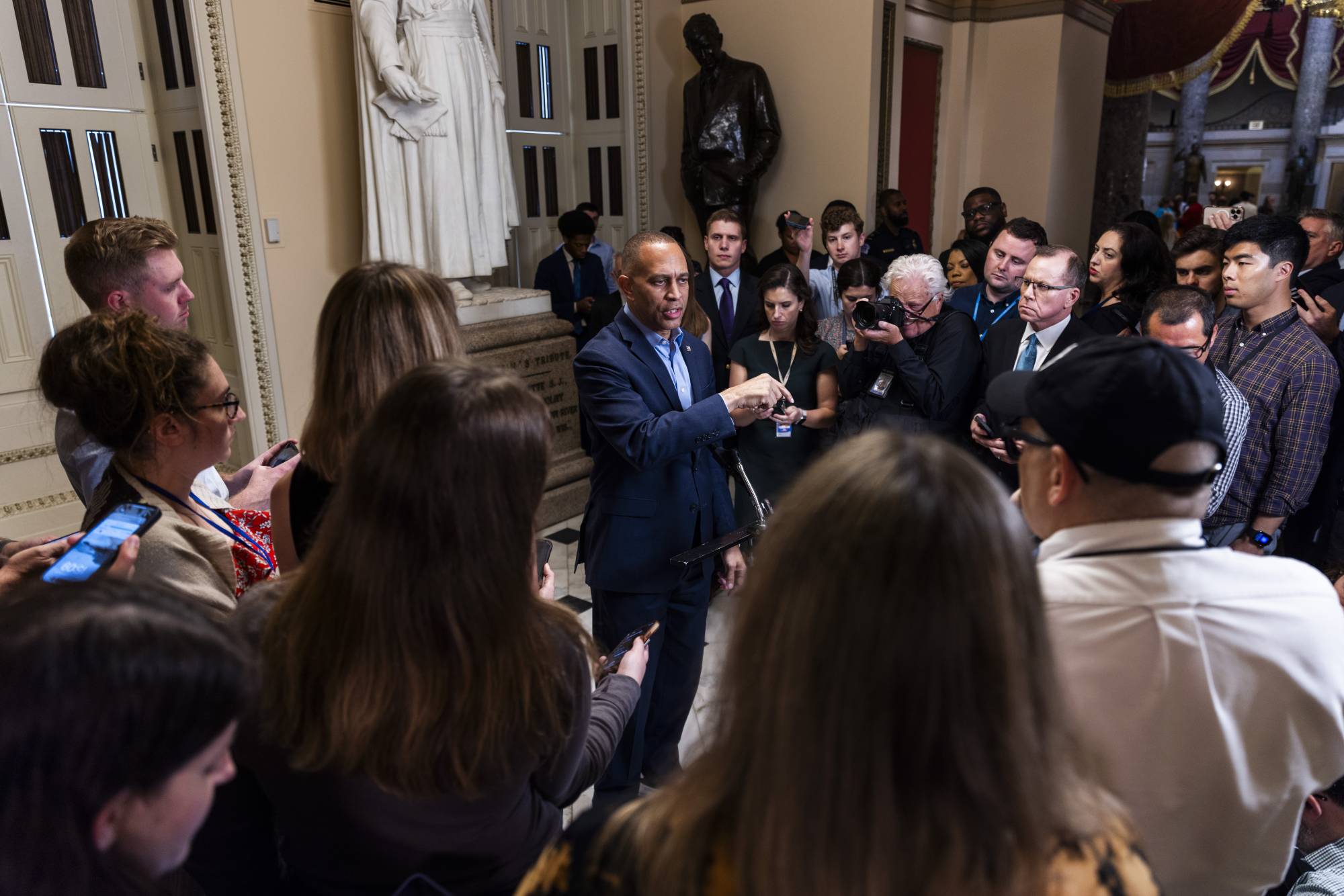 زعيم الأقلية في مجلس النواب حكيم جيفريز يتحدث للصحافيين حول مفاوضات الموازنة في مبنى الكابيتول (إ.ب.أ)