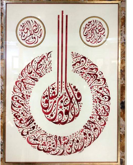 «المعرض يضم 37 لوحة وهو رقم يتماشى مع المسيرة الفنية لحسوبة، فهذا هو معرضه رقم 37، حيث يعرض في قاعات دار الأوبرا وساقية الصاوي منذ فترة طويلة»، وفق قوله، مضيفاً لـ«الشرق الأوسط»: «هناك لوحة مركزية كبيرة تتصدر المعرض مقاسها 150×165سم، وهي الحلية في وصف الرسول صلى الله عليه وسلم، ومعظمها بماء الذهب، بالإضافة إلى الزخرفة والكتابة، وباقي اللوحات على ورق مطوع للكتابة».