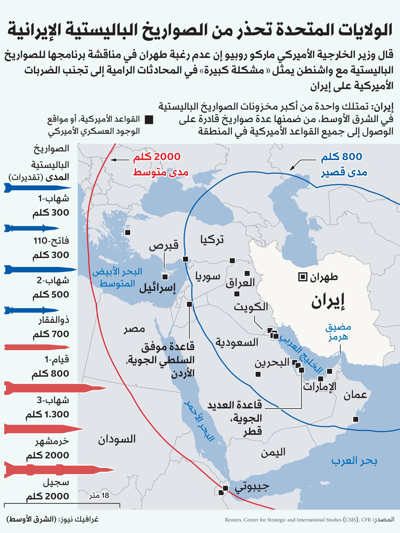 لكن روبيو قال إن رفض طهران مناقشة برنامجها للصواريخ الباليستية يمثل «مشكلة كبيرة» سيتعين التعامل معها في نهاية المطاف، مضيفاً أن هذه الصواريخ «مُصمَّمة فقط لضرب أميركا» وتُشكِّل تهديداً لاستقرار المنطقة.