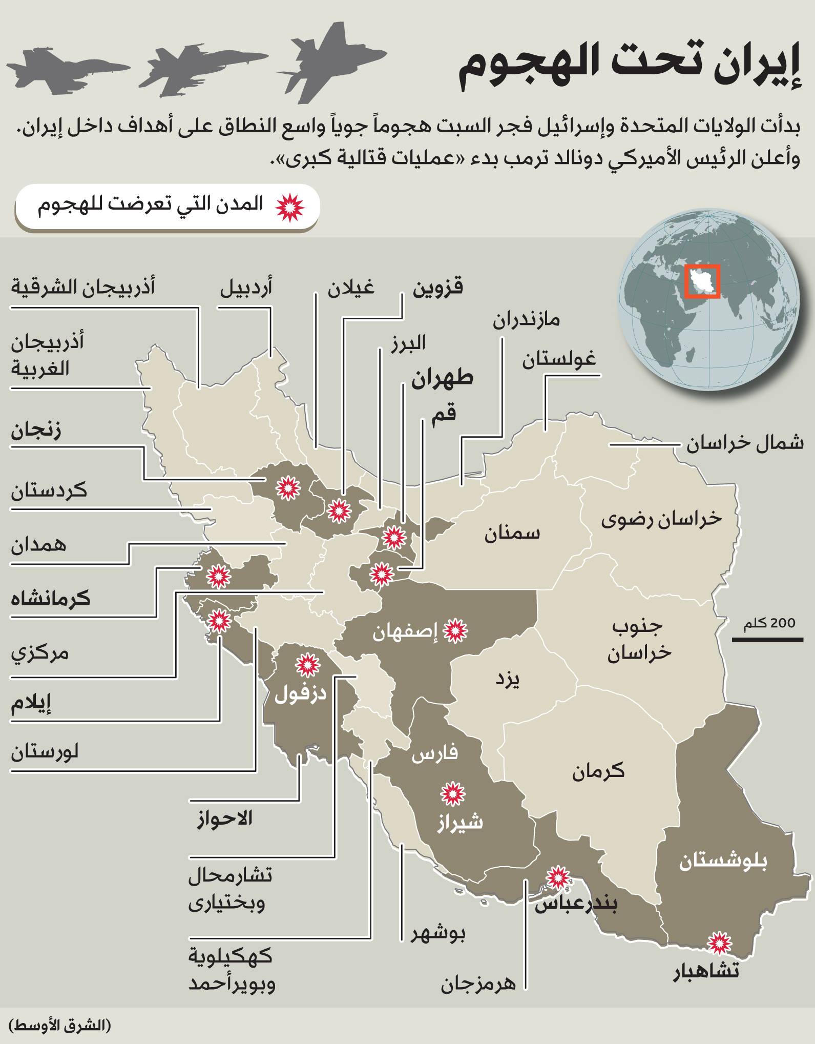 وسُمعت انفجارات في مدن عدة، بينها أصفهان وقم وكرج وكرمانشاه وإيلام وقزوين وشيراز ودزفول وزنجان، وفق وكالة «فارس». وأشارت وسائل إعلام إسرائيلية إلى أن الضربات الأولى استهدفت مواقع عسكرية ومصانع لصواريخ باليستية.