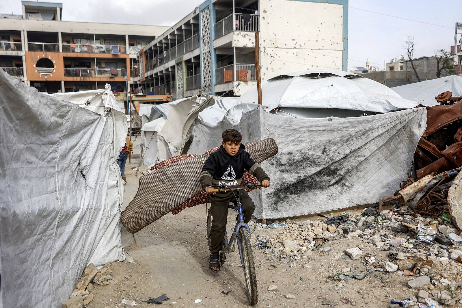 صبي يقود دراجة محمّلة بالسجاد والحصائر يمر بجوار خيام في مخيم مؤقت للنازحين شمال قطاع غزة (أ.ف.ب)